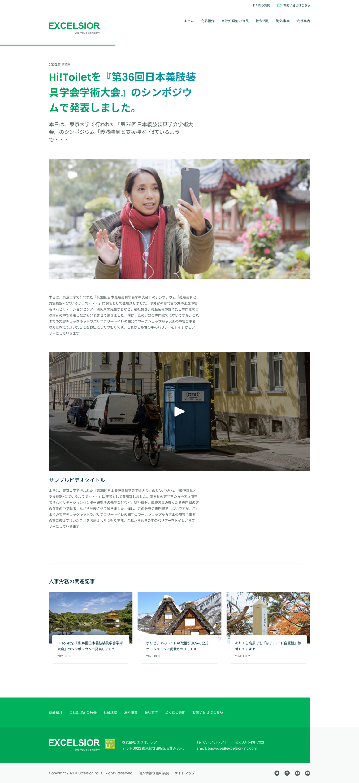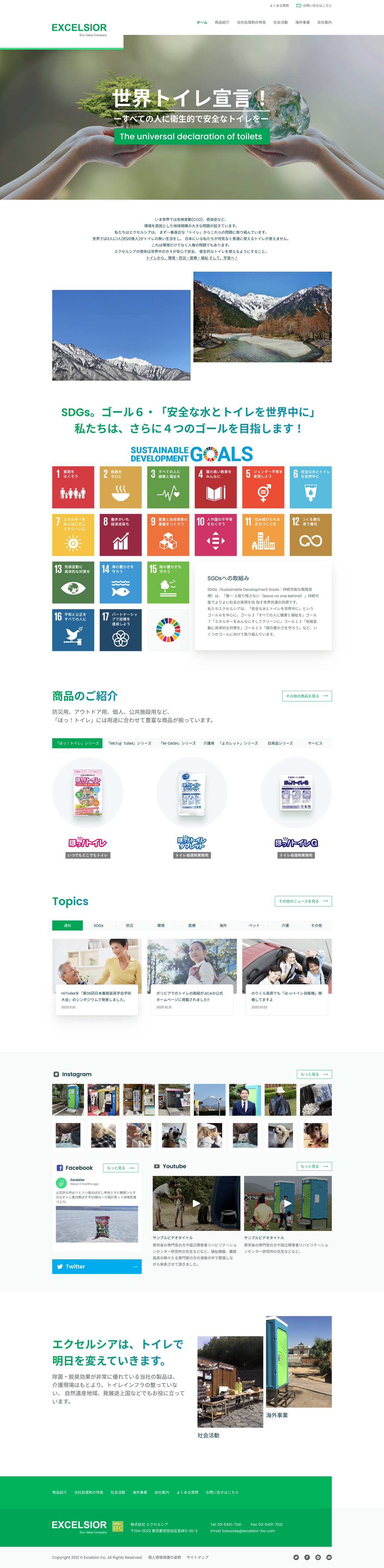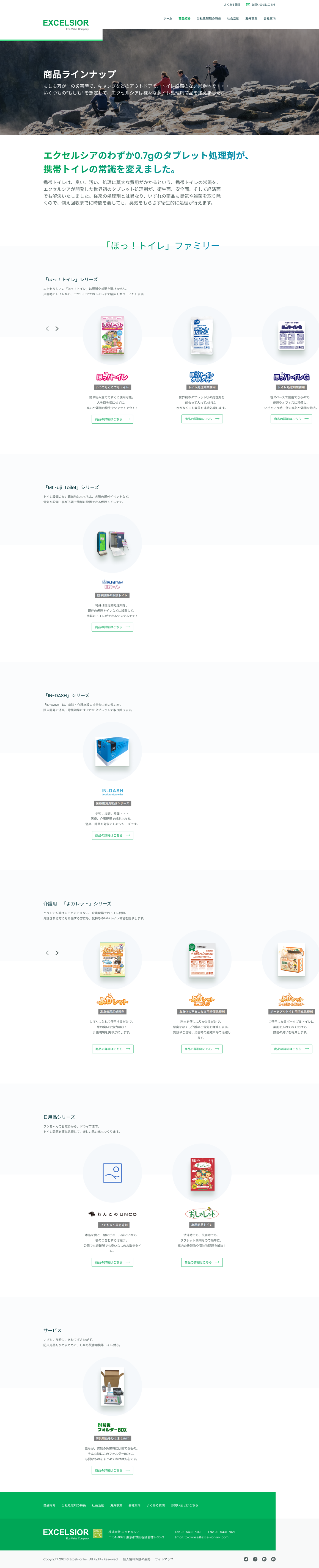 Excelsior is a Japanese company providing environmental services and specializing in products for natural disasters, emergencies and outdoor living since 1997. They invented the portable toilets for disasters such as the “Mt. Fuji Hot-Toilet”, that has been deployed to disaster areas in Japan. We designed the website to reflect their commitment towards environment sustainability.